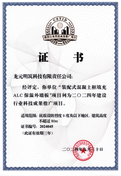 龍元明筑自保溫裝配式外墻板獲評2024年建設行業科技成果推廣項目